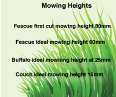 The first mow of Canberra Blend should be about 65 to 70 mm. In about a weeks time you can begin regular mowing at no less than 50mm. Mowing too short can weaken the turf by exposing the plant to extreme weather, traffic and can also encourage weeds. Santa Ana couch should be mown at 8-25 mm. For more information about ongoing turf maintenance please see here.